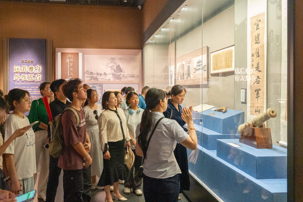 在位于湘阴的左宗棠故居,大家怀着崇敬的心情,聆听讲解员讲述这位晚清重臣在民族危亡之际力挽狂澜的壮举。19 世纪70年代,面对沙俄侵占新疆、阿古柏分裂势力割据的危局,左宗棠以69岁高龄力排“海防”“塞防”之争,坚持“重新疆者所以保蒙古,保蒙古者所以卫京师”的战略眼光,亲率大军“抬棺西征”,历时两年收复新疆全境。展厅内陈列的军事部署图、往来奏折及兵器实物,生动还原了他“先北后南、缓进急战”的军事智慧,以及“寸土不让” 的护国决心。师生们驻足凝视左宗棠手书“天地正气”匾额,深刻感悟其以生命践行“维护国家主权完整不分民族、不分地域”的担当精神。