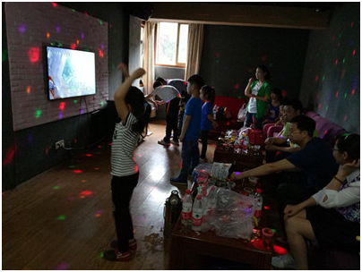 大部队到达山庄时,天公下起了小雨,预定的CS拓展活动无法开展。分会主席征求同志们意见后当即调整了活动方案,随即开展了室内KTV和棋牌娱乐活动。