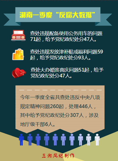日前,湖南省纪委通报了今年一季度全省查处违反中央八项规定精神问题的有关情况。数据显示,一季度全省共查处问题260起,处理446人,其中给予党纪政纪处分307人,涉及地厅级干部6人。