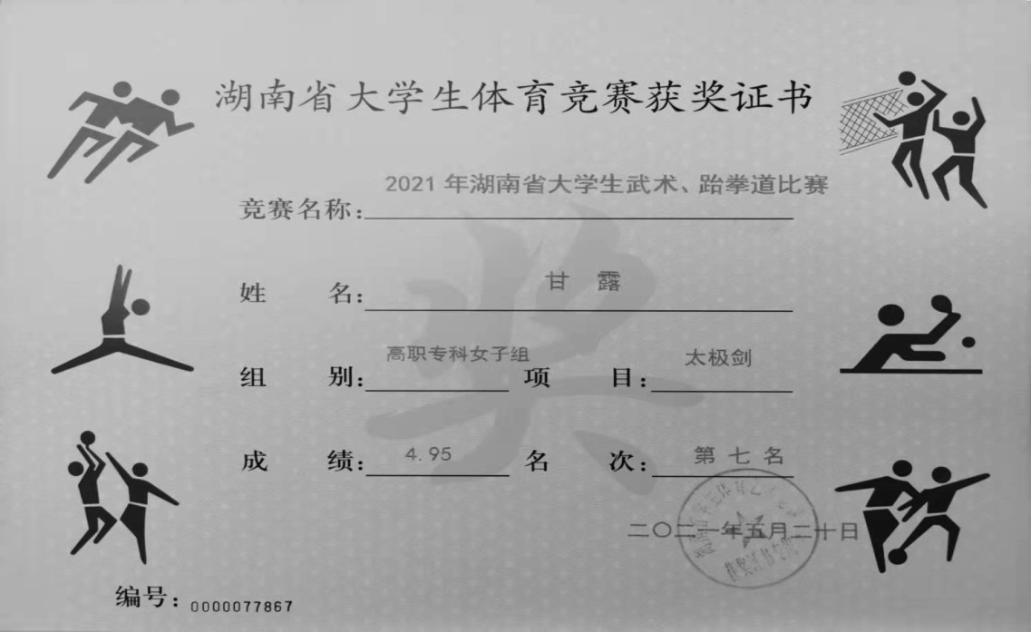 2021年5月20日至25日,由湖南省教育厅、湖南省体育局主办,湖南工业大学承办,湖南省学生体育协会协办的2021年湖南省大中学生武术、跆拳道比赛在湖南工业大学体育馆举行,本次比赛共有21所高职院校45支武术队和跆拳道队伍参赛。在基础教育学院谷茂恒、常诚老师精心指导下,我院武术和跆拳道代表队克服困难,取得了高职专科女子组67+KG项目银牌,高职专科女子组太极剑第七名和第八名的好成绩。