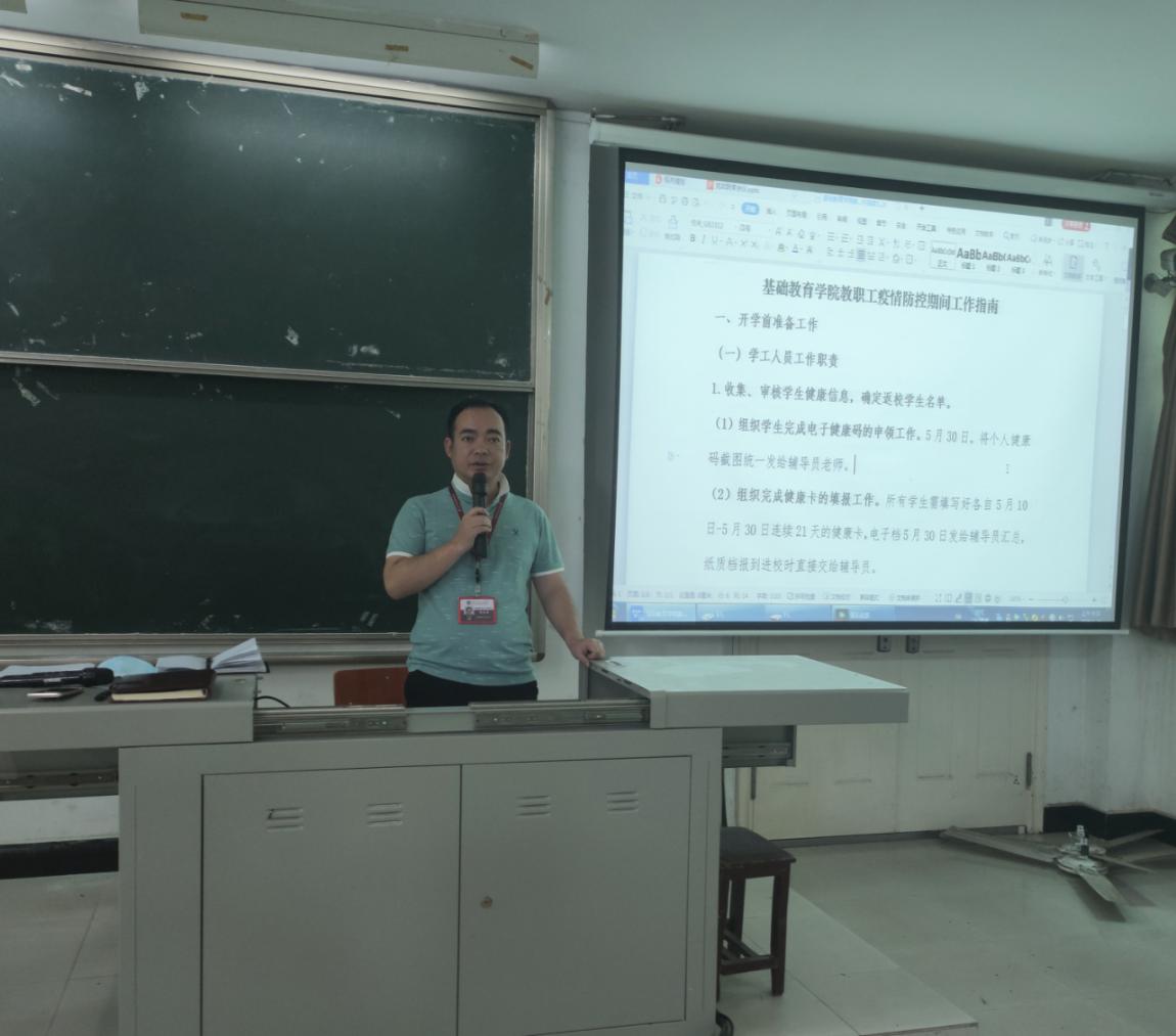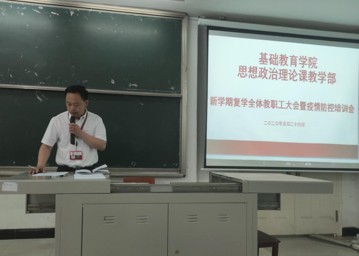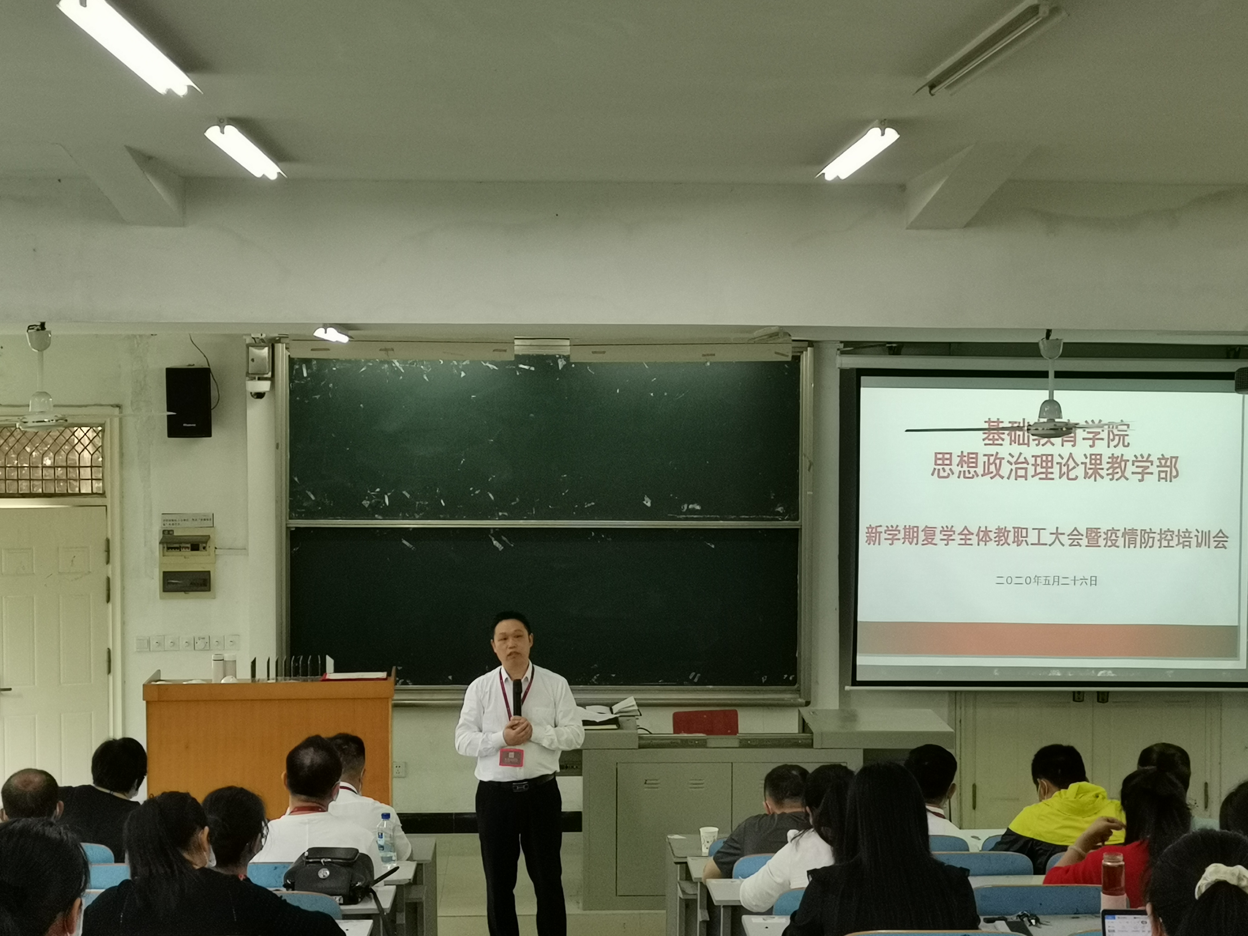 5月26日上午9点,基础教育学院(思政课部)在明礼楼1-113教室召开了2020年新学期复学教职工大会暨疫情防控培训会议,部门全体教职工参加会议,学院(中心)副主任曾大恒同志出席会议,会议由基础教育学院(思政课部)院长付正光主持。