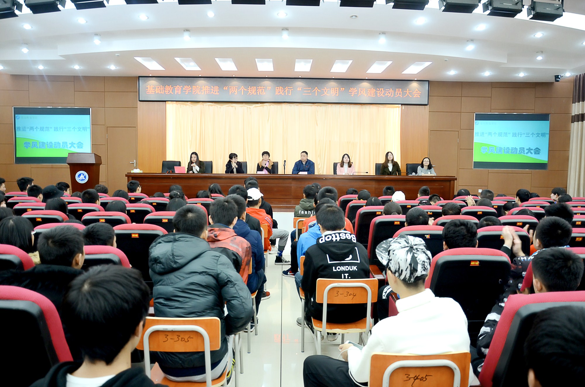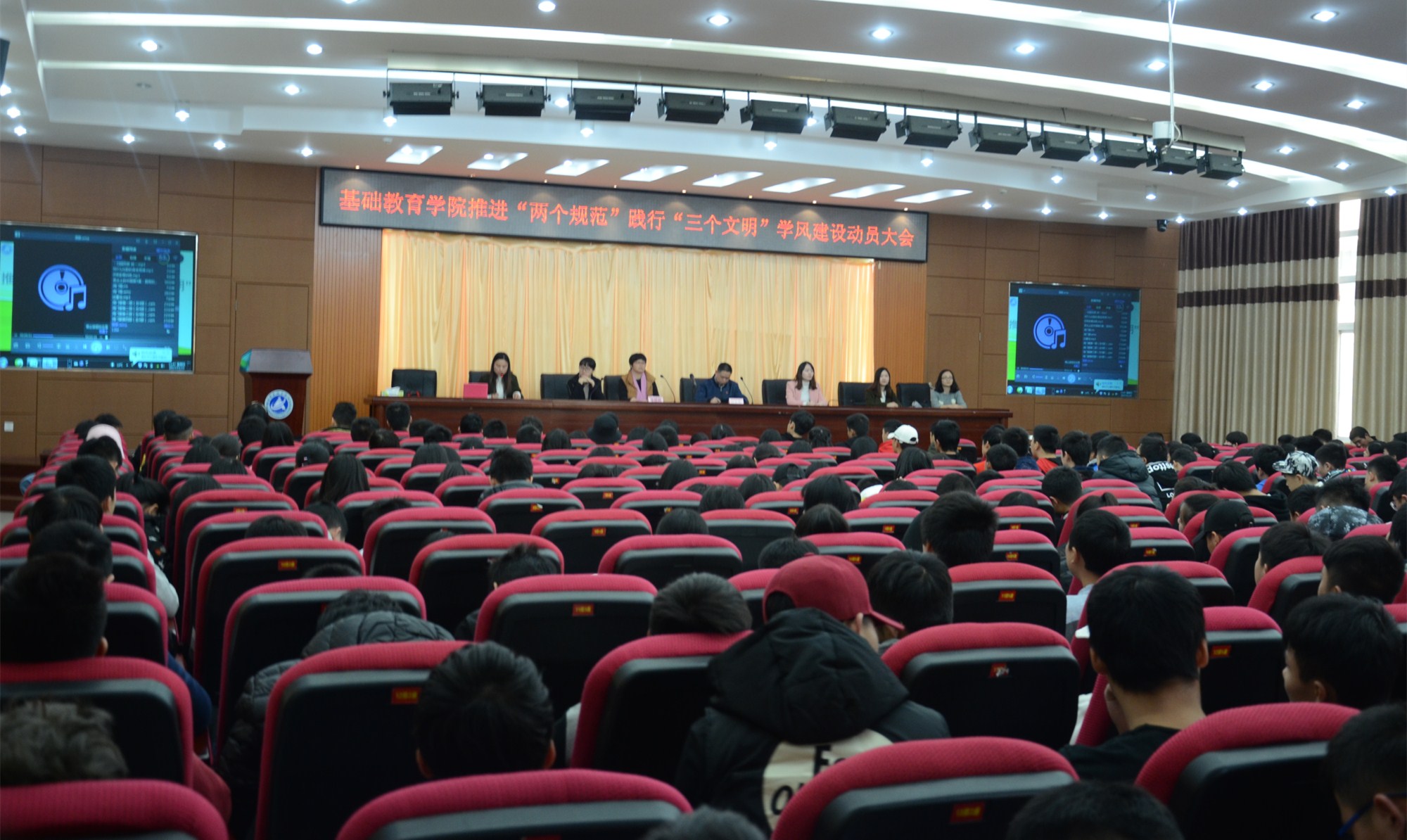 2017年11月23日下午3:30,基础教育学院在校图书馆五楼视频会议室召开了推进“两个规范”践行“三个文明”学风建设动员大会,学院党务工作负责人徐慰慰、行政工作负责人付正光出席大会,学院全体辅导员老师及2017级全体同学参加了大会,大会由基础教学院学生科负责人黄金玉主持。
