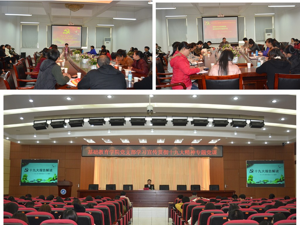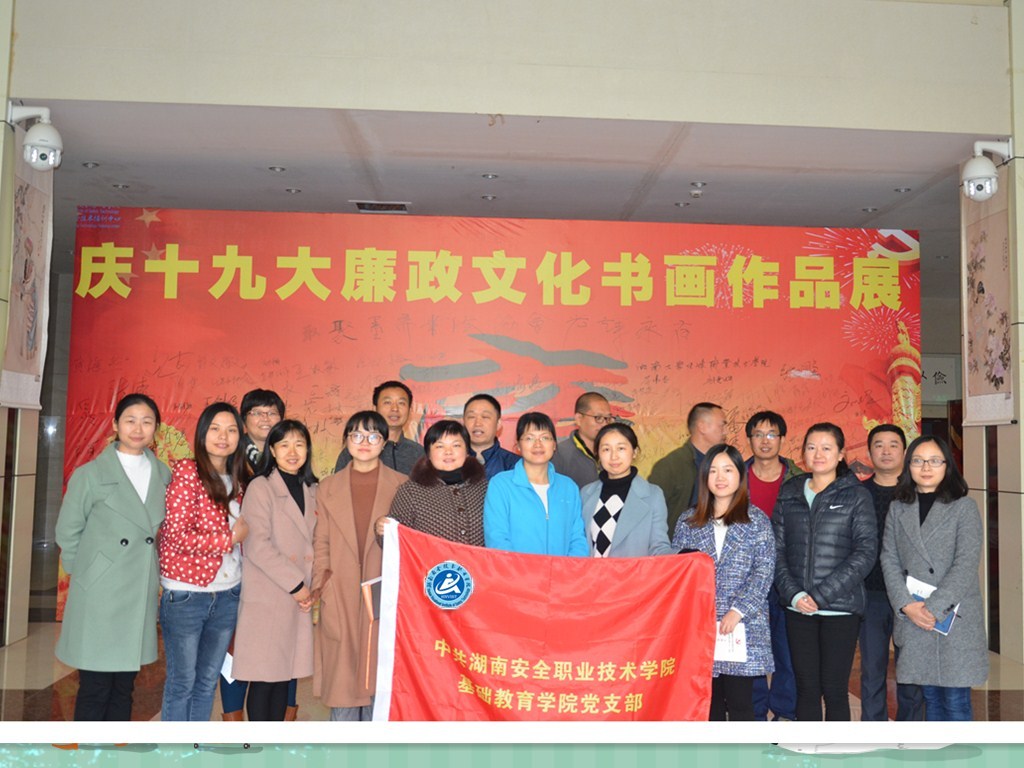 为认真学习贯彻落实党的十九大精神,基础教育学院党支部积极响应学院(中心)党委号召,通过采取会议传达、集体学习、集中研讨、参观庆十九大廉政文化书画作品展、观看“精准扶贫”主题电影《十八洞村》、赴浏阳(胡耀邦故居、秋收起义纪念馆、谭嗣同故居)参观学习、举办专题党课、召开党风廉政建设专题会等多种形式,全面持续深入学习宣传贯彻党的十九大精神。党员们纷纷表示,要不忘初心、牢记使命,切实把十九大精神贯彻落实到实际工作中去,以更加饱满的工作热情和更加奋发有为的工作态度,不断开创基础教育学院各项工作的新局面。(侯体湘)
