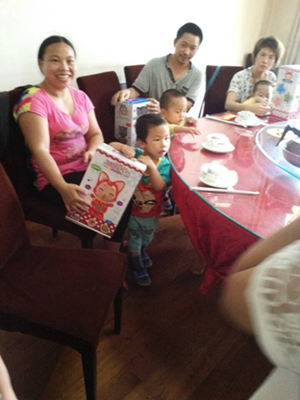 在聚餐过程中,部分志愿者们帮忙照顾孩子,梁瑞升老师和旷春秀等人则与家长们一起交流,更多地了解残障患儿的情况。一位来自宁乡的妈妈回忆起带着儿子四处求医看病的艰辛,她饱含着眼泪,对志愿者说,来到湘雅博爱医院接受治疗快三年了,这是第一次有人请他们吃饭,她很感动。平常在家里,有亲戚家办酒席,她一般都不带孩子去参加,因为就是亲戚也有点嫌弃孩子。今天,看到了她儿子拿着智能机器猫的小玩具,爱不释手,她心中又燃起新的希望。临走时,可爱的孩子们,紧紧抱着安全职院青年志愿者们给他们的礼物,用他们那稚嫩而残缺的声音,向志愿者们说:“谢……谢……”。孩子们的脸上,露出了会心的微笑;志愿者的眼眶里,却噙满了心酸的泪水!
