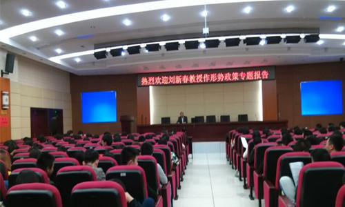 10月31日下午,受思政课部邀请,湖南农业大学马克思主义学院院长、硕士生导师刘新春教授来我院作《形势与政策》专题报告,来自学院各系、各部门约300名师生参加了报告会。